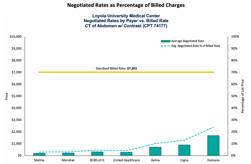 Payers can use hospital transparency data to gain insights regarding the rates hospitals have negotiated with other payers, which potentially can be used during contract negotiations. For example, payers can evaluate the negotiated rates for specific hospitals compared to their competitor health plans to gauge alignment with their proposed rates and discounts. This is illustrated in Figure 2, which shows the average negotiated rates for a CT scan of the abdomen (CPT 74177) for each payer who contracts with Loyola University Medical Center near Chicago, compared to the hospital’s standard billed charge for the procedure. As shown in the graph, the average negotiated rate as a percentage of billed charges (list price) ranges from 3% to 24% (about $200 to $1,800).